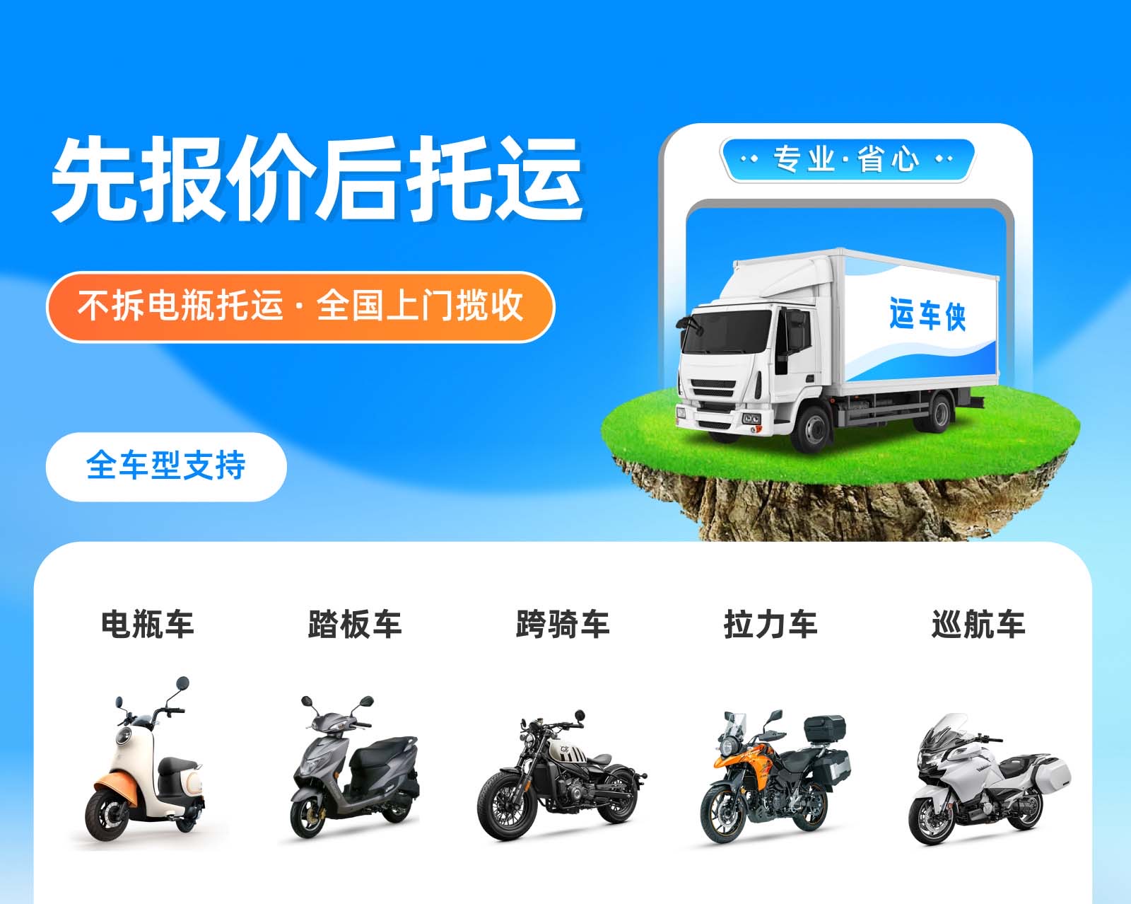 运车侠专注电动车专属托运,资质齐全、线路成熟,以专业标准化服务,为车主爱车运输全程保驾护航,是靠谱的电动车托运优选品牌✅。